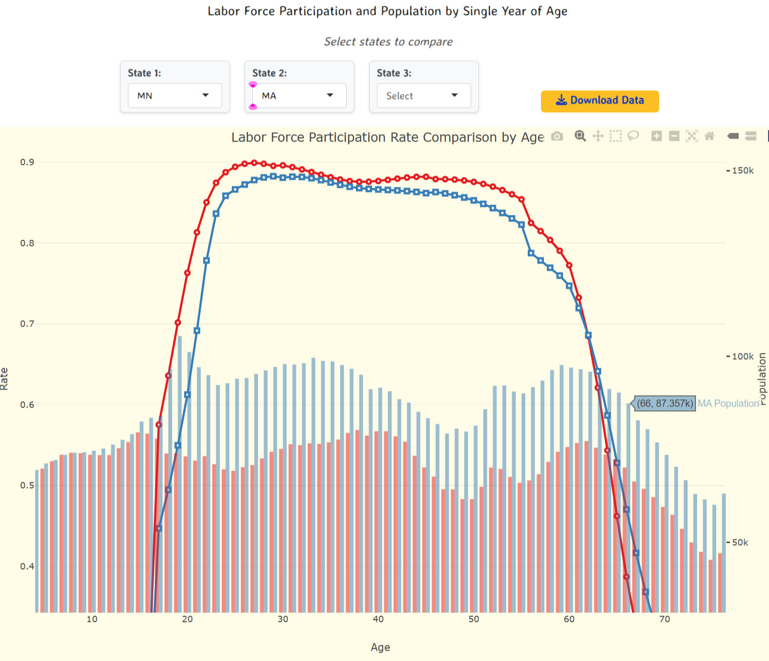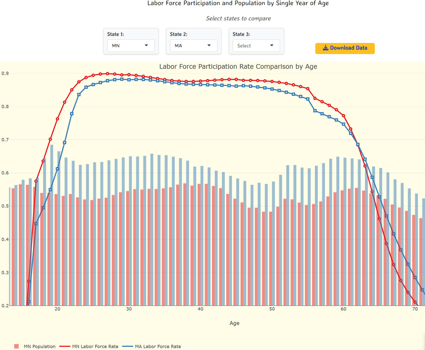 Fusion of Census Bureau ACS and Bureau of Labor Statistics labor force participation data, combined with the latest population estimates by 1 year age group from the Census Bureau.