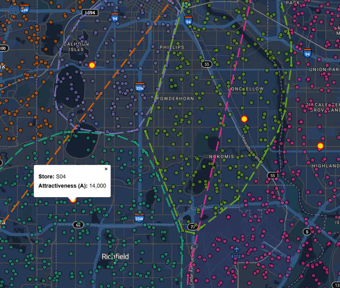 Map-based analysis app for modeling market coverage and competition within a metro market; 'what-if' analysis and scenario-construction (eg: "what happens if we add a 10,000 sf location here?")